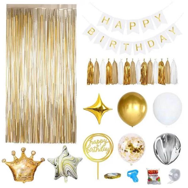 60 de baloane de diferite culori; 1x balon în formă de coroană; 2x baloane în formă de stea cu cinci vârfuri; 2x baloane în formă de stea cu patru vârfuri; 1x cortină din panglici strălucitoare; 1x banner Happy Birthday; 5x set de ciucuri decorativi colorați; 1x decor pentru tort Happy Birthday; Panglică decorativă, accesorii pentru legarea baloanelor, adeziv și bandă de fixare a baloanelor.