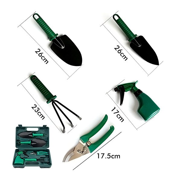1 x Set de unelte pentru grădinărit cu cutie de depozitare: 1 x greblă, 2 x lopeți pentru plantare:, 1 x foarfecă, 1 x sticlă cu pulverizator