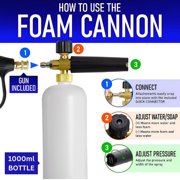 🚗 Schimbați cu ușurință între lancea de spumă și duza pentru aparat de spălat cu presiune.