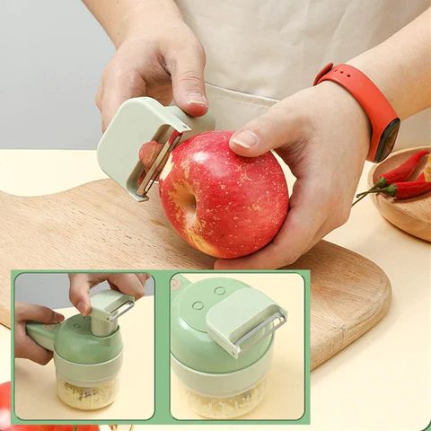 🔪 Unealtă multifuncțională 4-în-1 – Taie, toacă, curăță și decojește în câteva secunde.